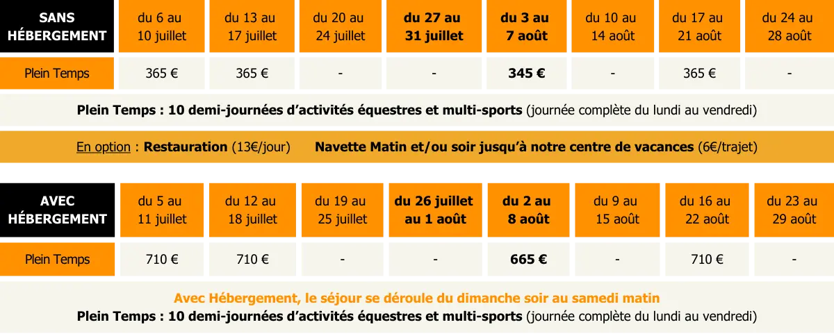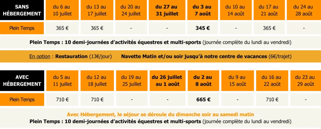 Passion Équitation : Que tu sois débutant ou déjà cavalier, progresse à ton rythme. Apprends à soigner ton cheval, à le seller et à devenir son meilleur complice en manège comme en balade. Le Plein d’Aventure : Lâche les rennes et vient tester tes limites en escalade, vise dans le mille au tir à l’arc ou biathlon ou défie le vide dans les parcours accrobranche…